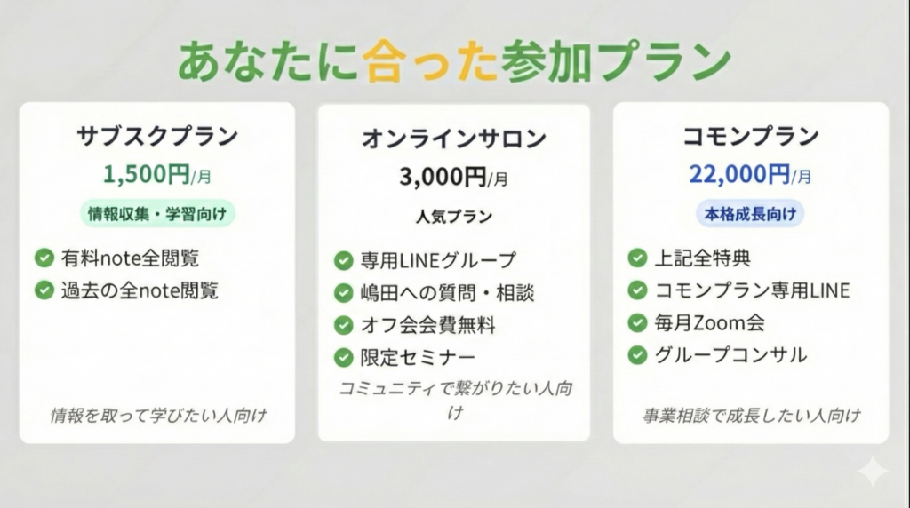 - 嶋田に直接相談できる定期ミーティング(コモンプラン以上)